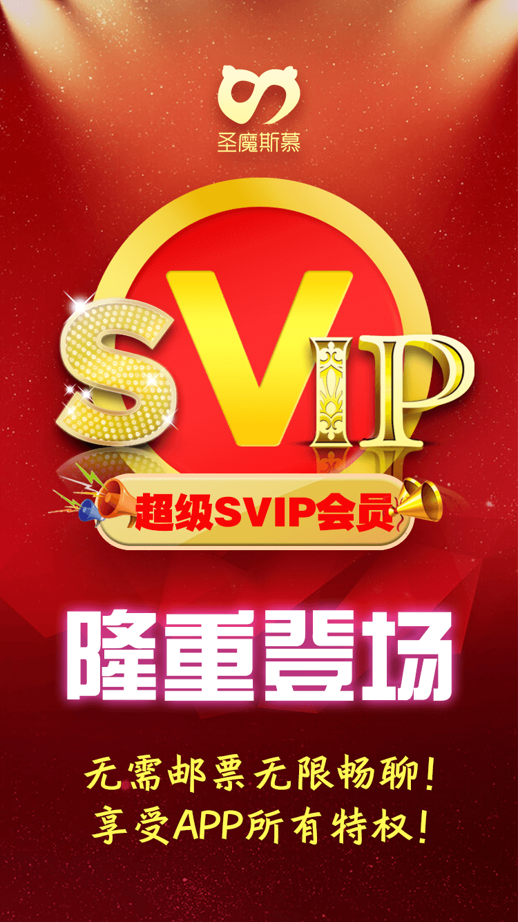 “超级SVIP会员”是应每日发信息较大的同好强烈要求而推出的(后台统计显示,部分同好每天消耗邮票可达几十、上百元),SVIP将省去邮票环节,发信息更加便捷、也更加优惠!年费SVIP平均每天仅需3.6元(不到两张邮票的钱),即可不限量给任何人发送消息,并且其他人给SVIP发消息也无需邮票,让您的斯慕交友畅通无阻!斯慕资源有限,开通SVIP会员将更加领先一步,大大提高交友成功率~